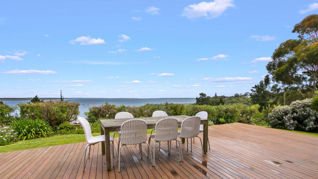 Welcome to Aegina, a stunning two-storey contemporary retreat perched above Lake King and Boole Poole in Metung. Expansive water views and serene surroundings create the perfect backdrop for an unforgettable getaway, where modern design meets natural beauty in every detail.
